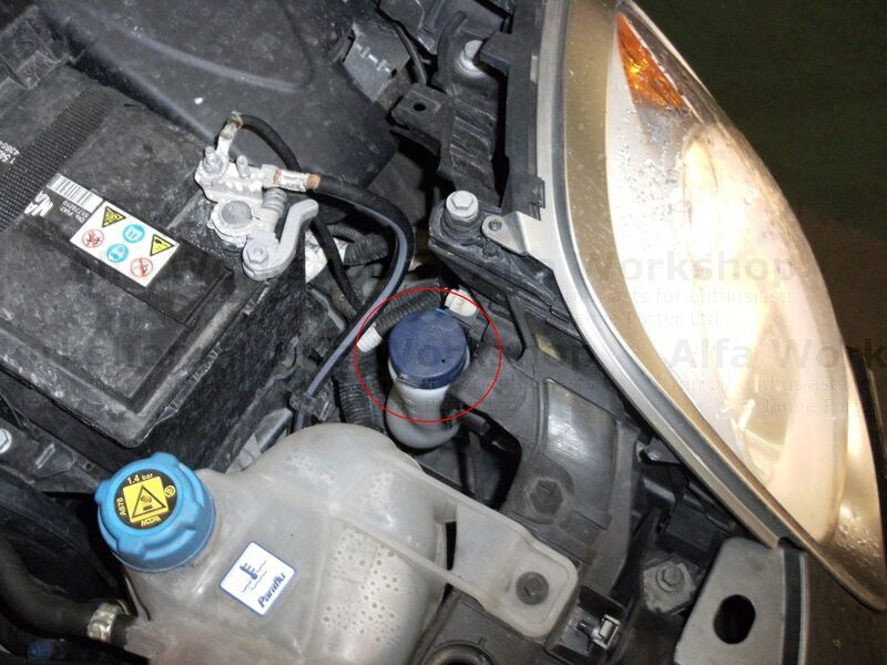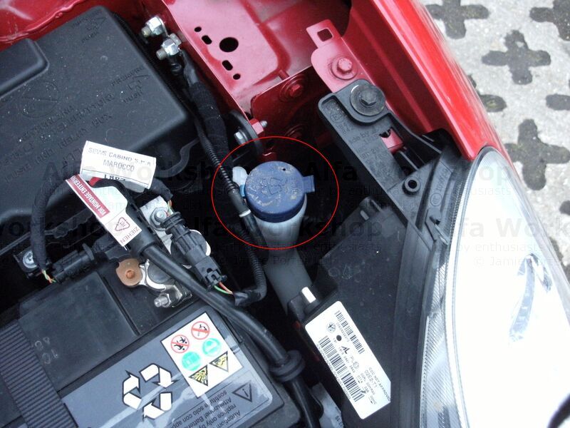 On a MiTo the screen wash bottle is just behind the left hand headlamp (circled in the photo)
