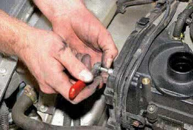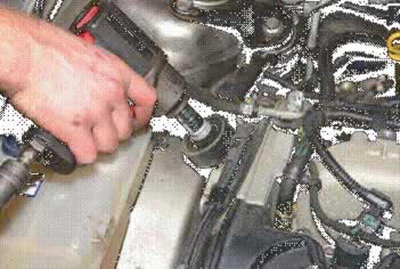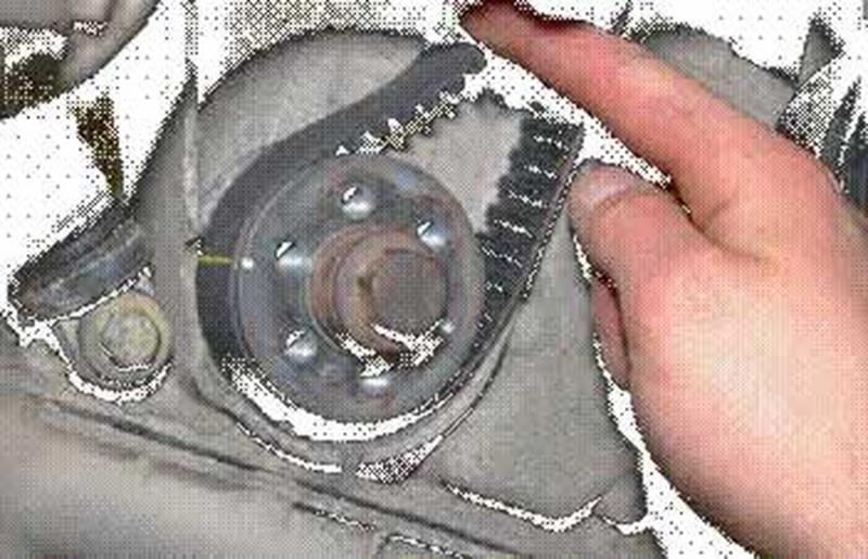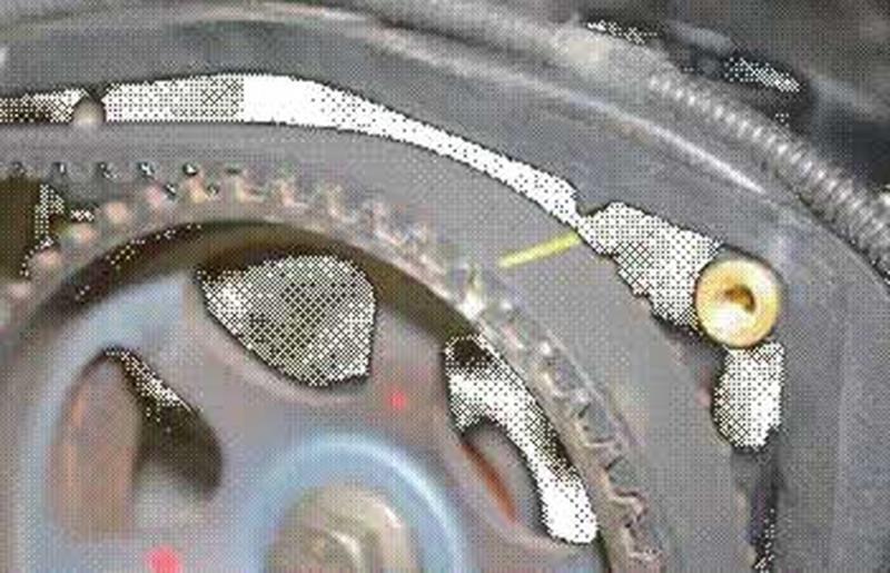Remove engine mounting. You can now remove the cam belt, however before you do this, align the only timing mark on the cam pulley with the cut in the cover, marks are indicated.