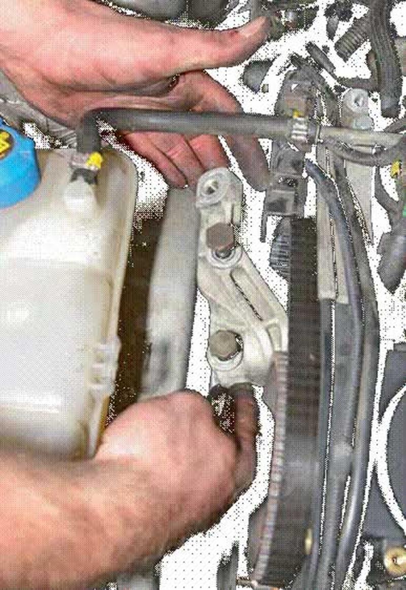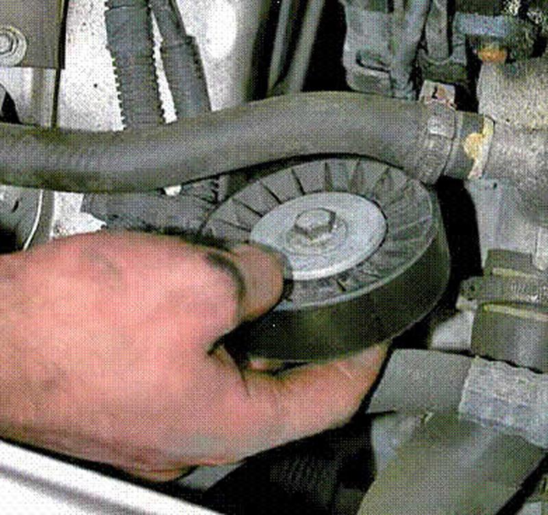 Remove auxiliary belt, note that the adjustment is on the idler in front of the drive pulley not the tensioner behind the drive pulley. There is also a rubber insert in the centre of the drive pulley and this has a tendency to fail causing a rattling noise either when cold, on full lock or with the air conditioning on.