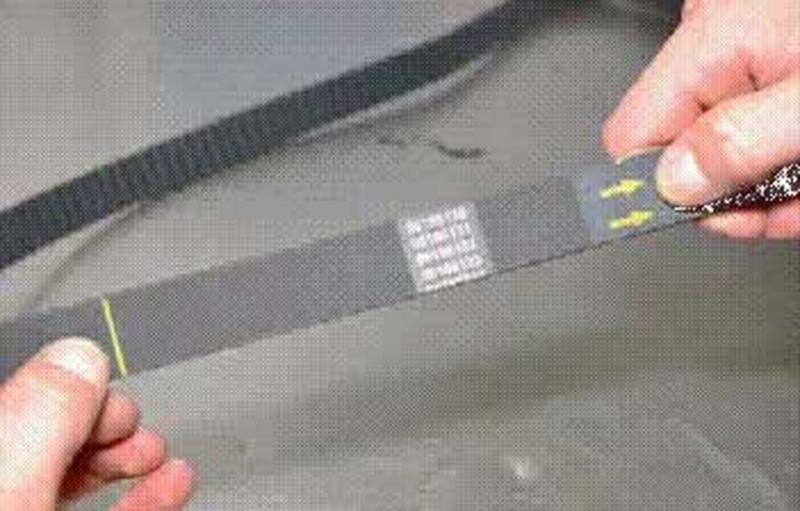 Correct tension is indicated when the arrow on the tensioner lines up with the hole in the tensioner’s body.