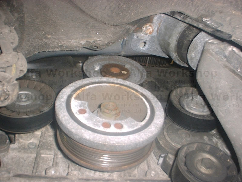 Now we have to remove the auxiliary belt and both its tensioner and idlerand it is also best to remove the lower crankshaft pulley at this point. Next remove the covers from the cam belt, the upper cover is secured by three fasteners and then it pulls vertically upwards to remove.