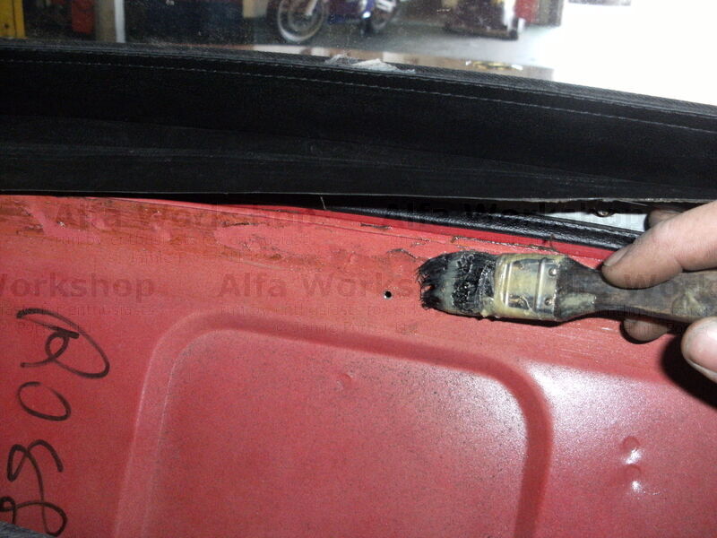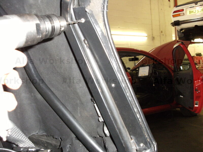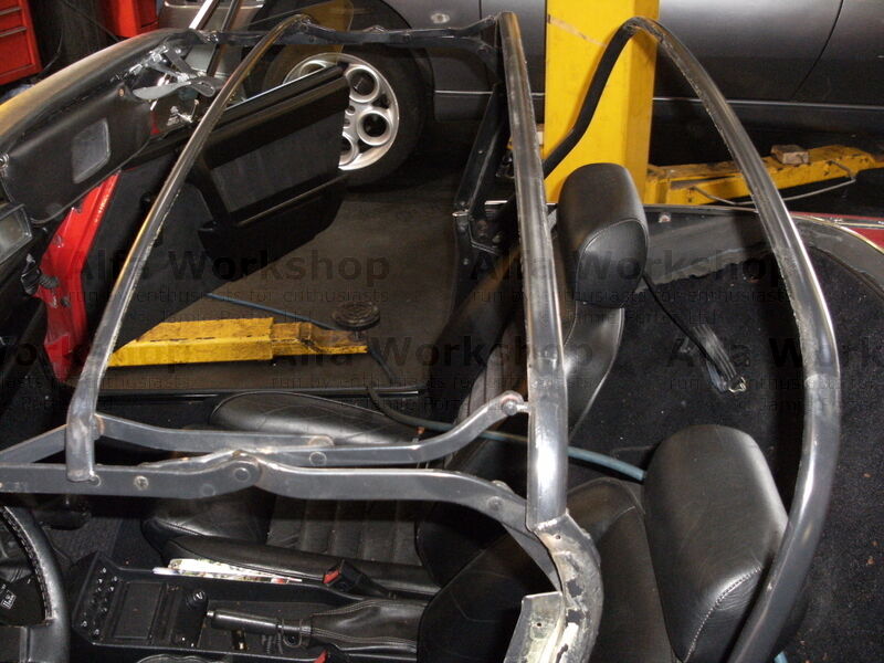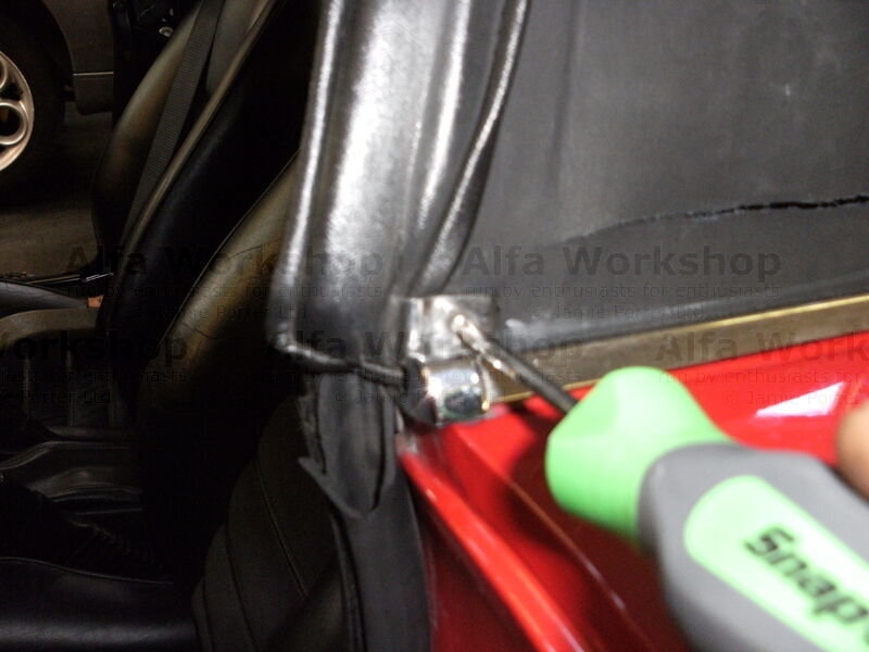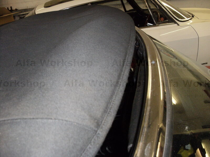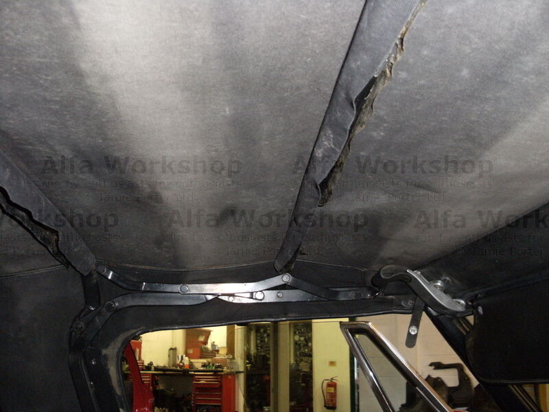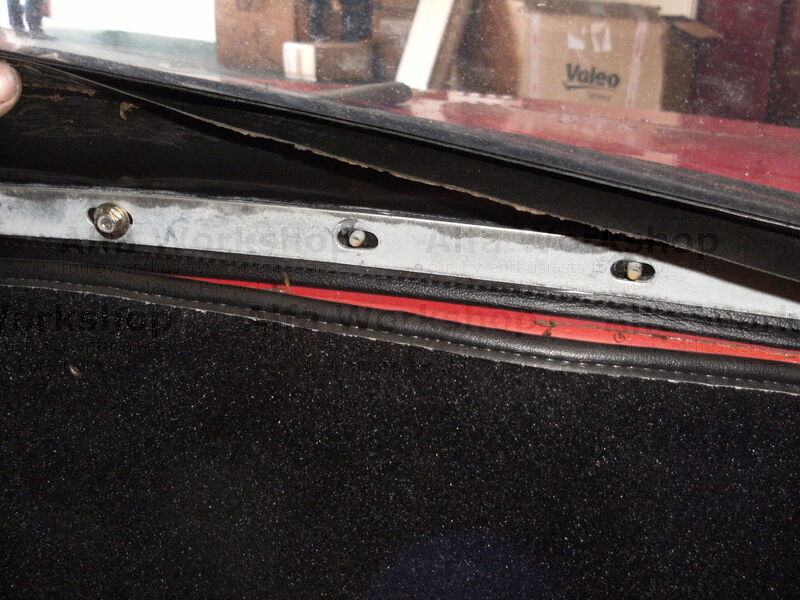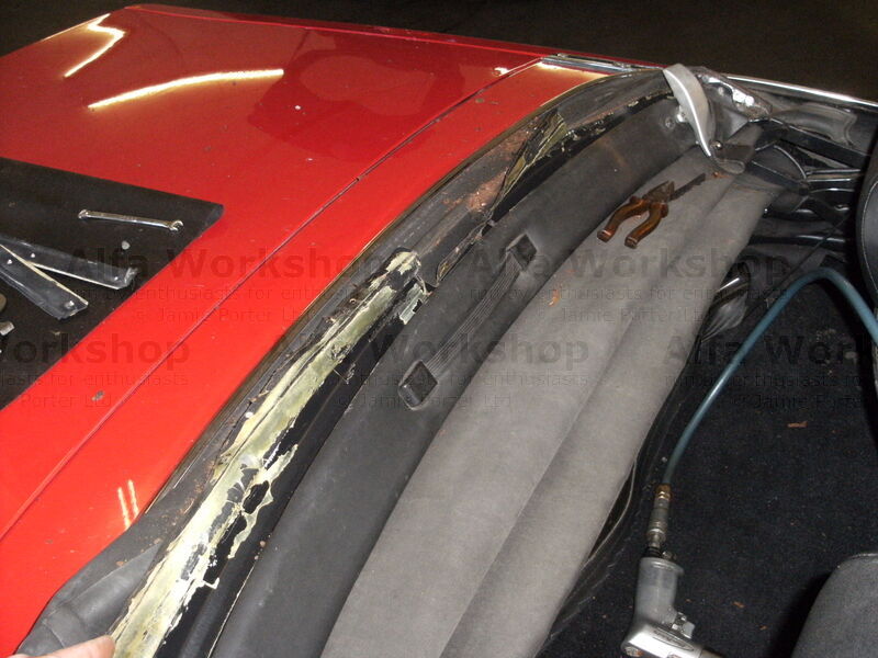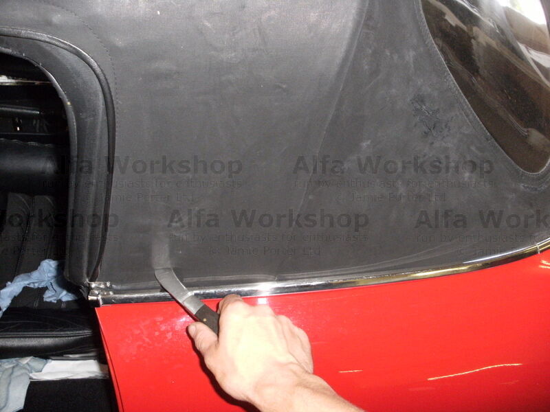 Lift up the remains of the hood round the rear of the passenger compartment, then undo the small screws that are hidden in the carpet, about 6cm down from the top lip, lift up the vinyl trim and unbolt the retaining metal bars. You can now remove the remains of the hood but please take care of the thin vinyl strip as it is very easy to damage