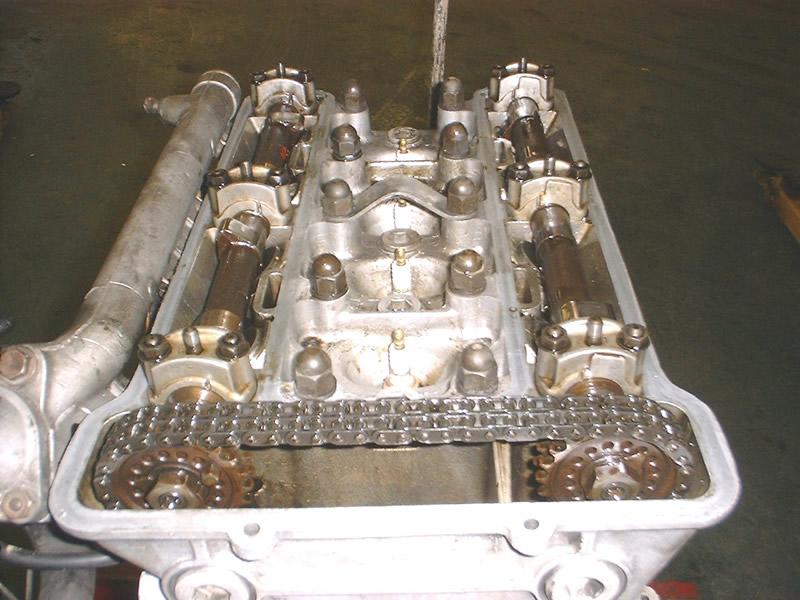 The next job is to remove the rocker cover, this is secured by the 6 fasteners along the top of the engine and two M6 bolts on the front. The camshaft chain tensioner needs to be slackened using the 14mm nut on the front of the head when the chain is loose this needs to be tightened. The camshaft drive chain then needs to be removed, there is a split link in the chain which you have to find and undo, noting that the closed end faces the direction of travel. The cylinder head can now be removed, this is secured by the 10, 19mm capped nuts between the camshafts and 2 M8 nuts either side of the camshaft chain chest, these go up into the cylinder head.