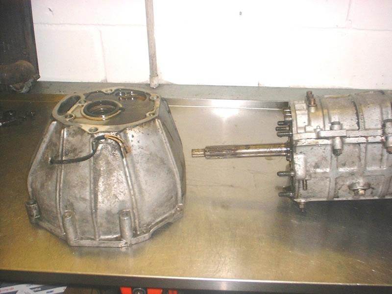 The bell housing can then be removed by undoing the 17 mm nuts inside it. Once these have been removed, a sharp tap will unstick the bell housing from the body of the gearbox.
