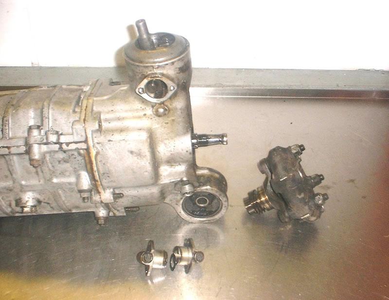 Next we turn our attention to the rear of the box and we remove the drive flange nut and then pull the flange off, the gear lever stub now needs to be removed.This is done by undoing the two breathers either side of it and then prizing the domed cover off. Under this you find a plate with the device that stops you going from 5th into reverse this also has to be removed.