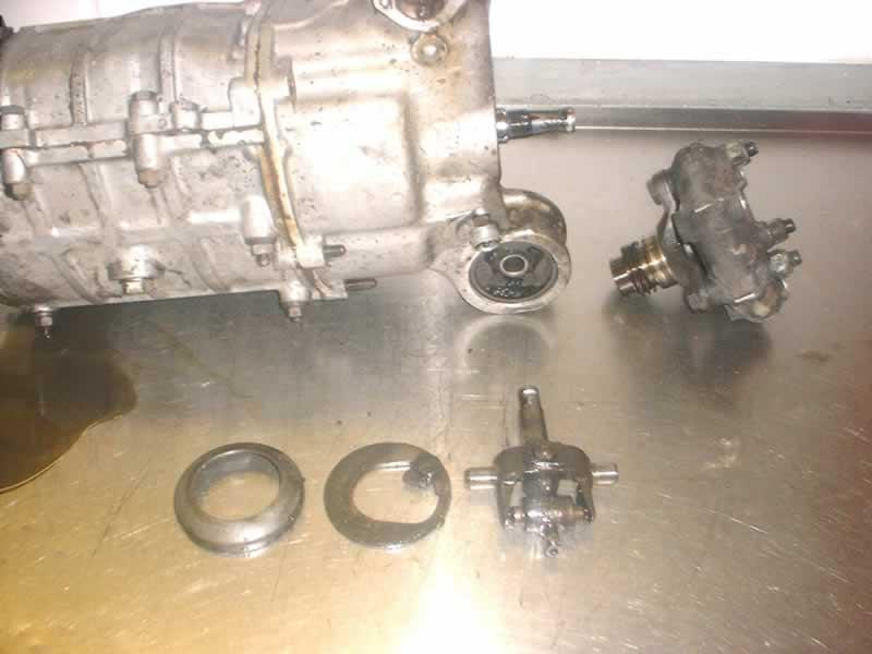 Now we have to separate the two remaining halves of the gear box, before we do this we need to remove the 5th /reverse selector fork as it stops the two halves separating, this is done by removing the 11 mm bolt that secures it and pulling the shaft backwards. The two halves of the box can now be split and the shafts simply pull out,