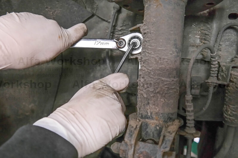 On the early models undo the top bolt connected to the shock absorber bracket using a 17mm spanner to hold the ball joint while removing the nut with a 16mm socket.