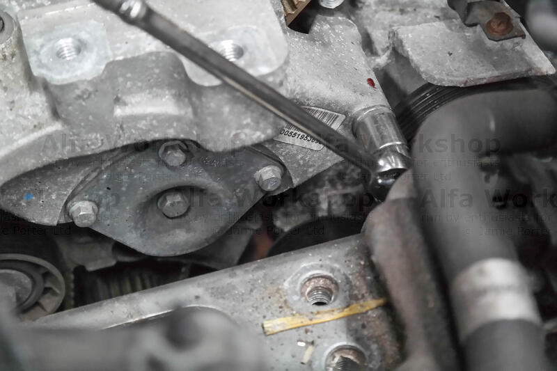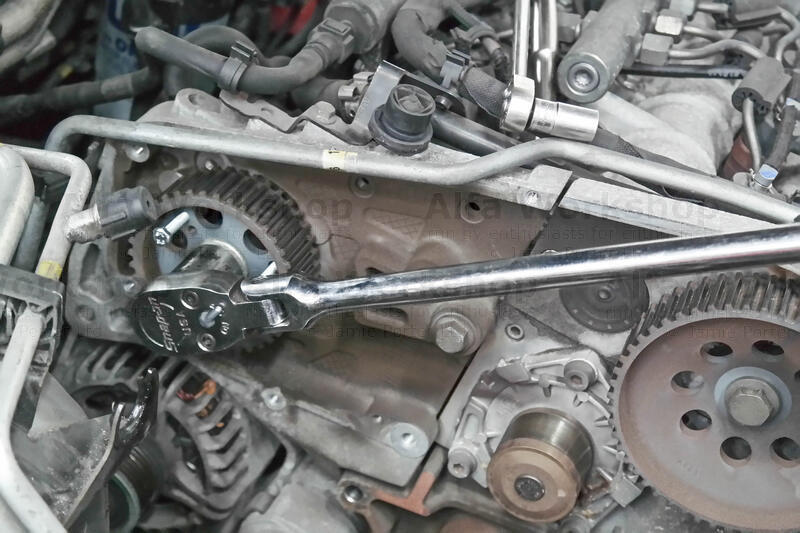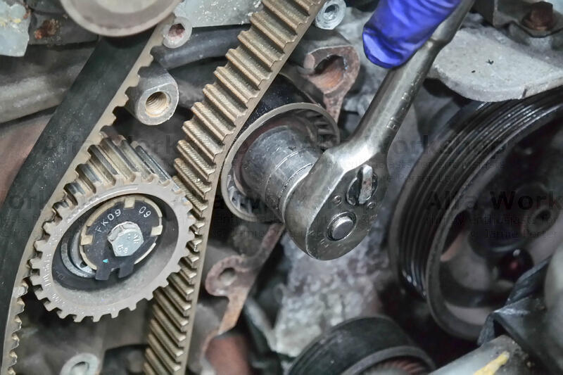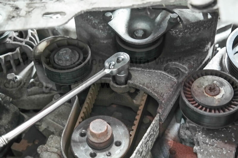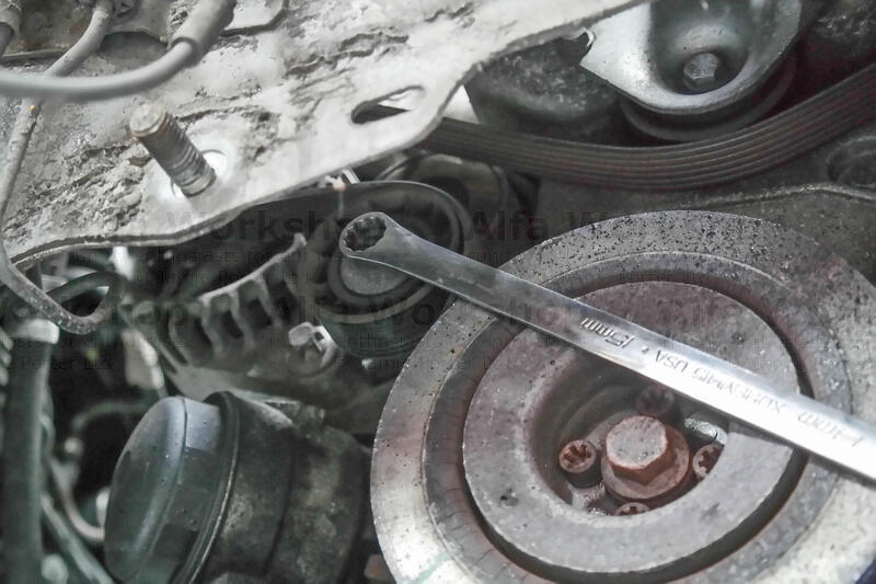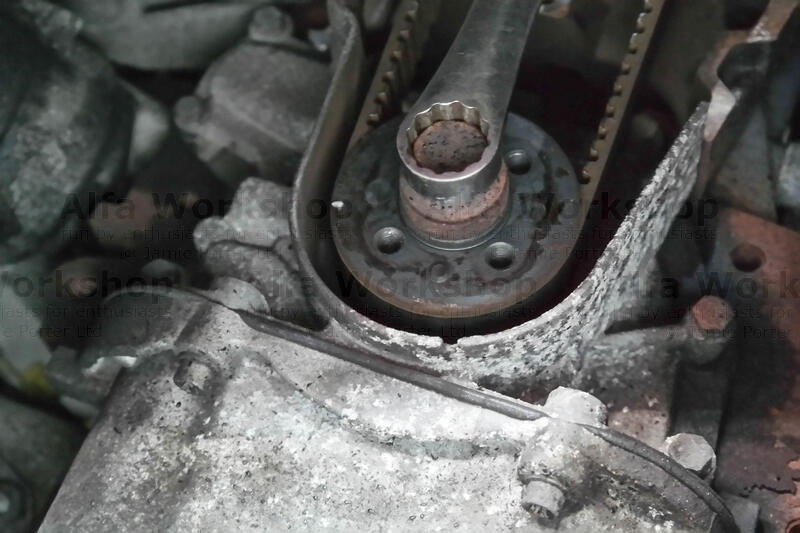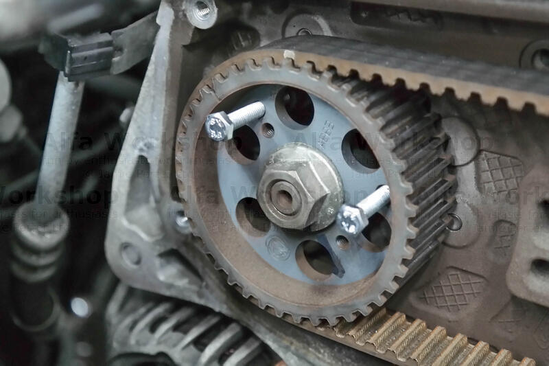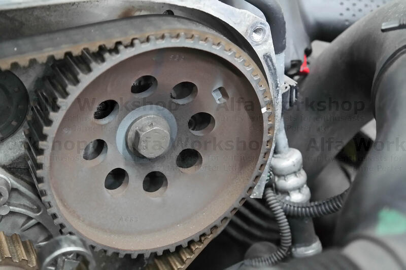 The cam belt needs taking off so rule of thumb, to align all the pulleys use a 19mm spanner to rotate the bottom pulley clockwise until the raised circular indicator coincides with the notch on the engine casting….