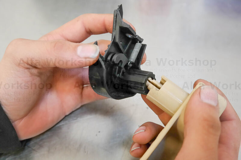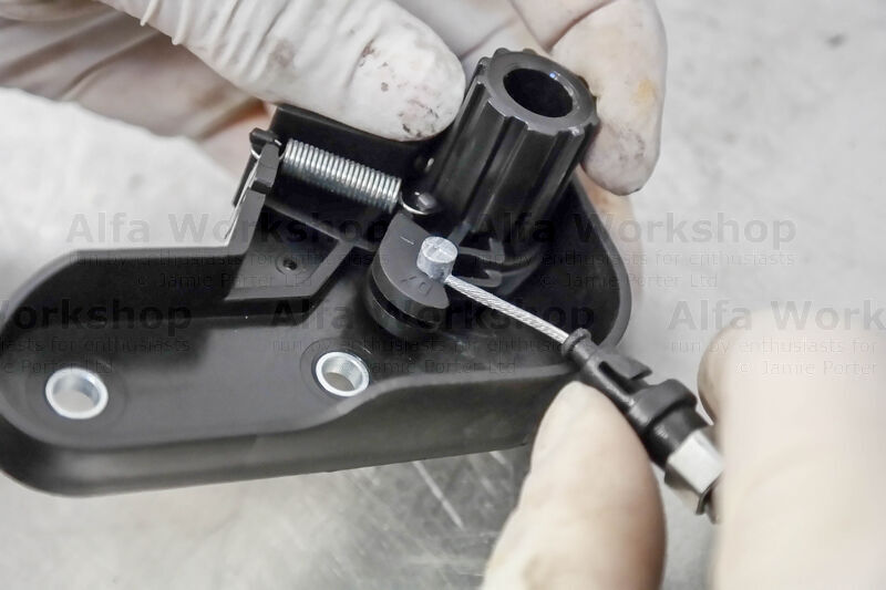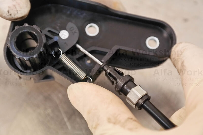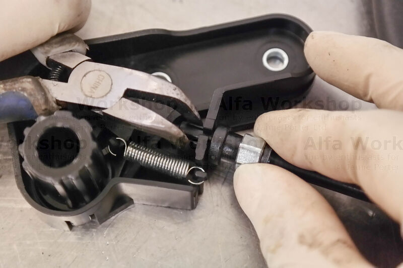 We are going to show you how to release the bonnet cable from the work bench but you will have to do this in situ. Press in the side locking tabs on the plastic nozzle…..