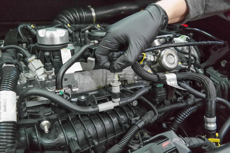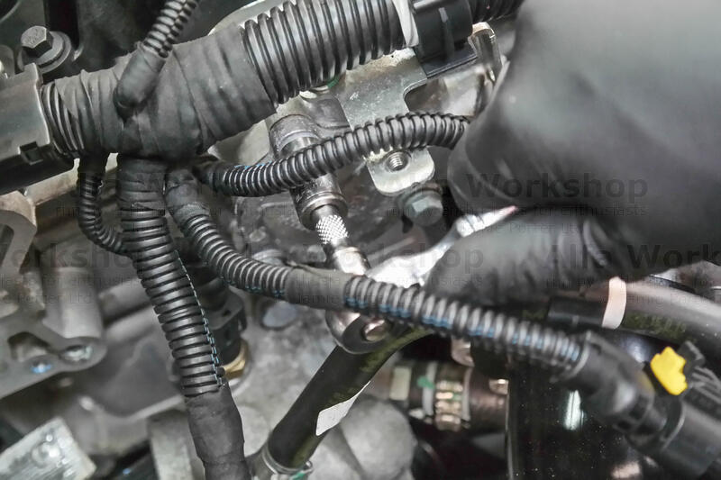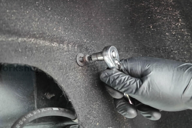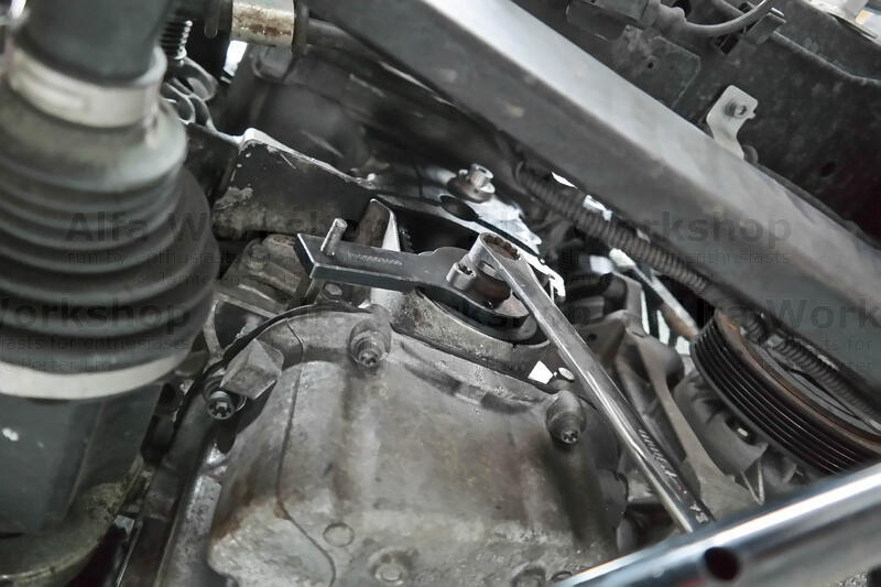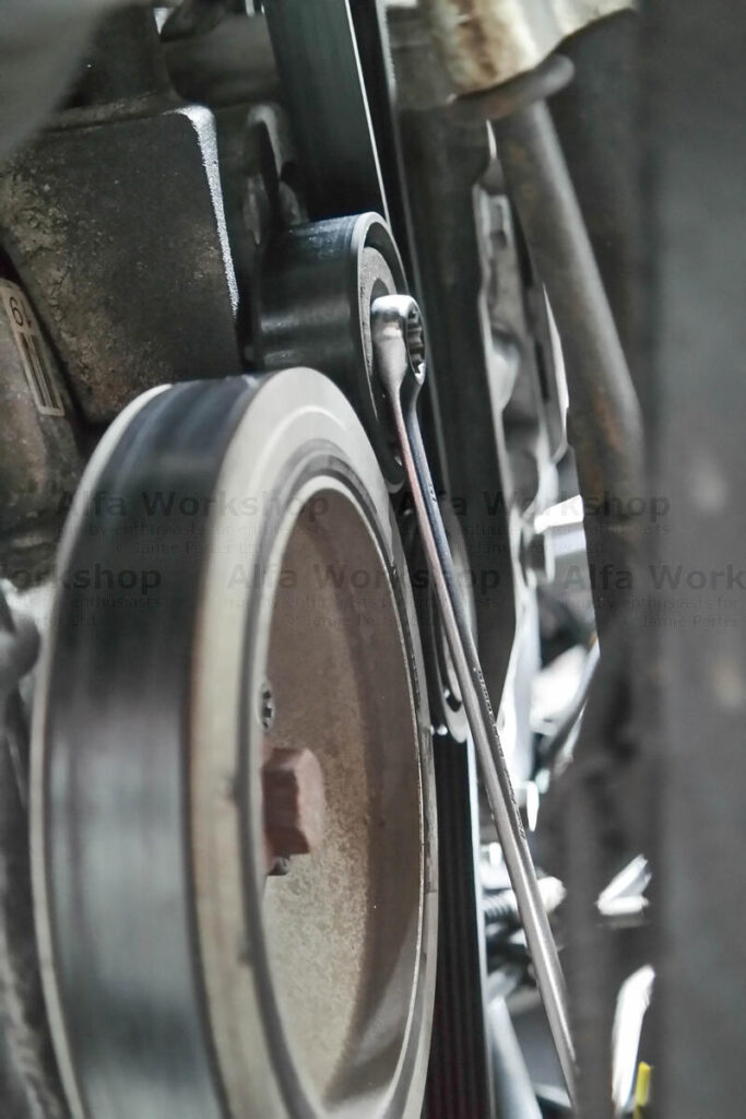 Put a spanner on the 15mm nut to the auxiliary tensioner idler and rotate clockwise to take the tension out of the auxiliary belt so that the belt can be removed.