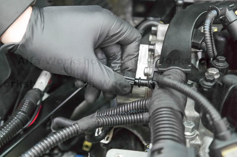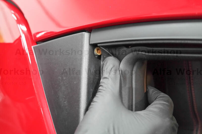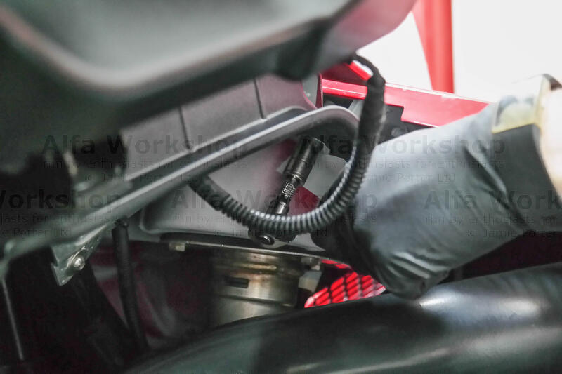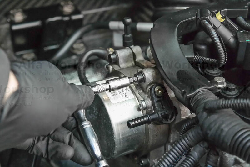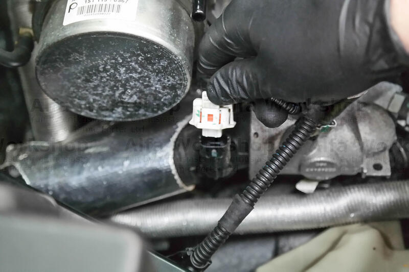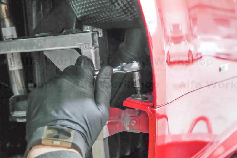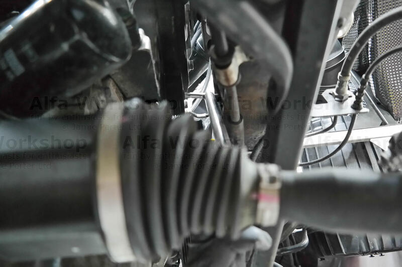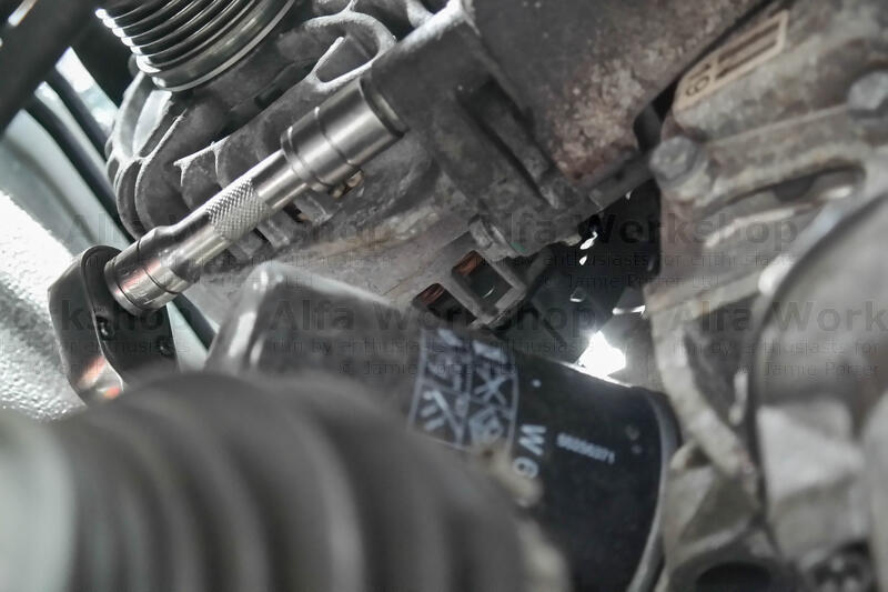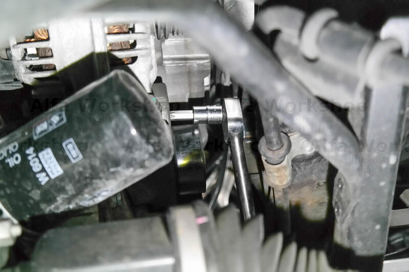 Undo the x2 lower 13mm bolts to the alternator (just above the oil filter).