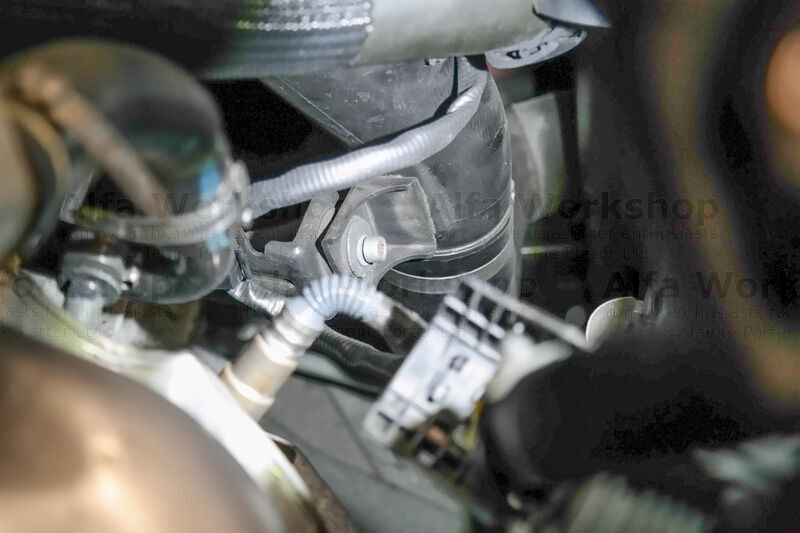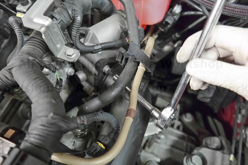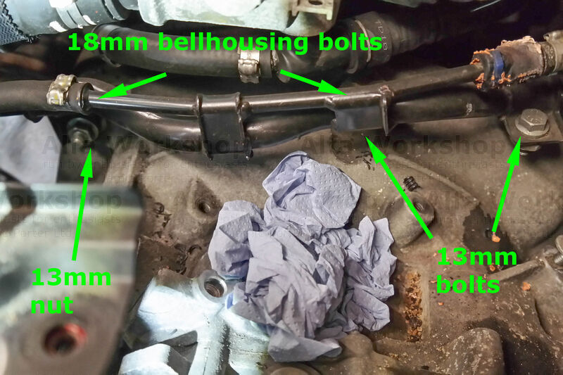 Undo the 13mm nut and x2 13mm bolts to the brackets for the coolant rail and cable tie the rail up to the thermostat. Now you can undo the x2 18mm bolts to the top of the bellhousing.