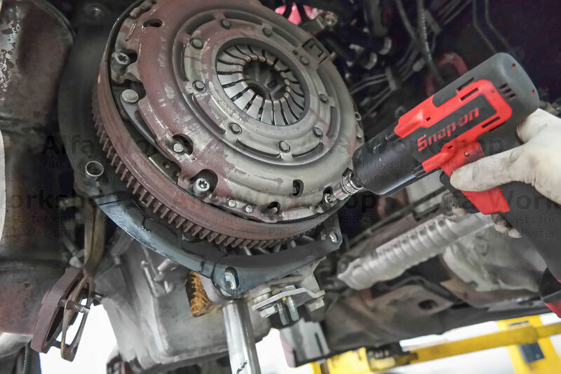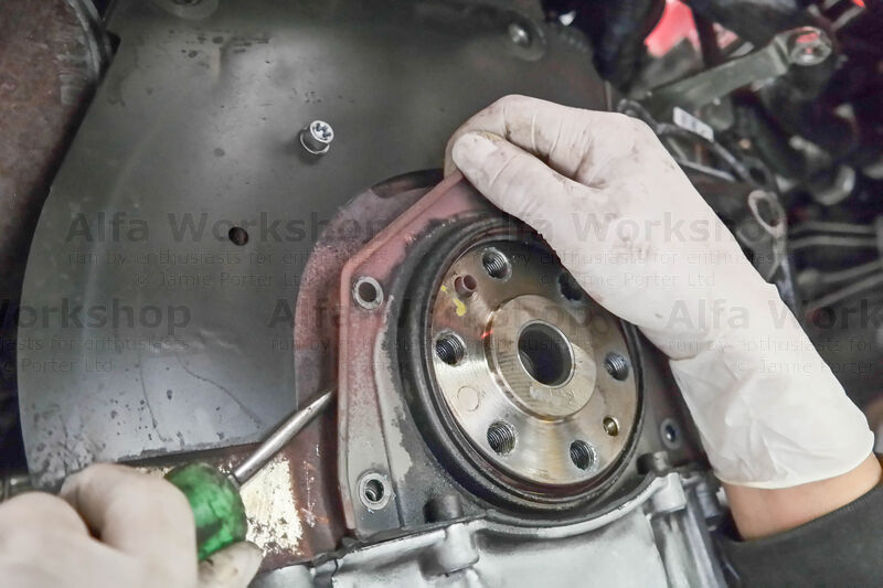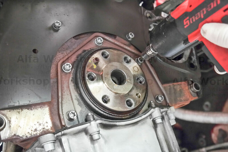 Undo the x6 R13 (Rib) bolts to the flywheel.