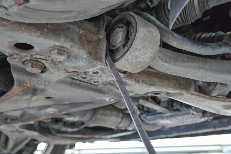Once you have the front inner bush in place you can lever it into position for the bolts.
