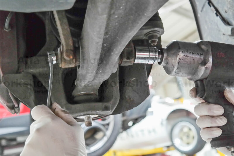 Undo the 21mm nut (or 18mm 50500429 depending on model) to the wishbone ball joint.