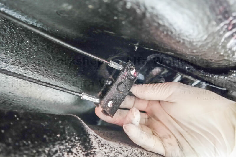Pull both the handbrake cable sleeve ends out of the bracket to give play to the cables.
