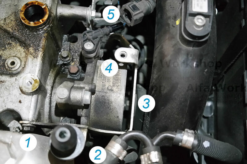 Now to shake off the vacuum pump shield so disconnect the pumps breather hose. The bolts & nut are all 10mm so undo nut 5, bolt 4 is below the vacuum pump bolt, 3 goes through the inlet manifold pipes bracket, 2 is again below the vacuum pump bolt and just loosen bolt 1….
