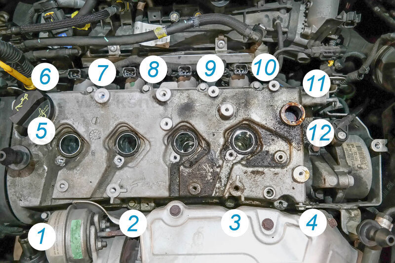 Undo the 10mm bolts 1-10 then unbolt 11 on the bracket.