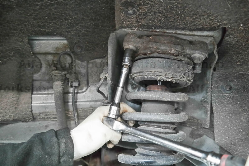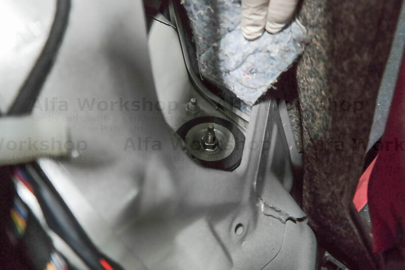 Looking down you will see a recess filled with a piece of insulation, remove that and underneath is the 16mm top nut and pad to the shock absorber which you need to undo and remove.