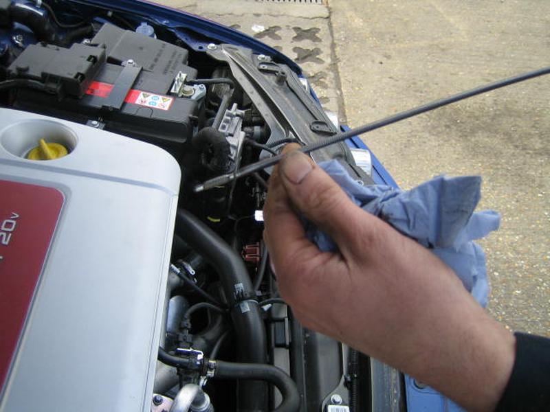 1:- Park car on level ground and remove dip stick, It is best to do this warm but doing it cold is a lot better than not doing it at all (Note, the dipstick may be in a different place on your model)